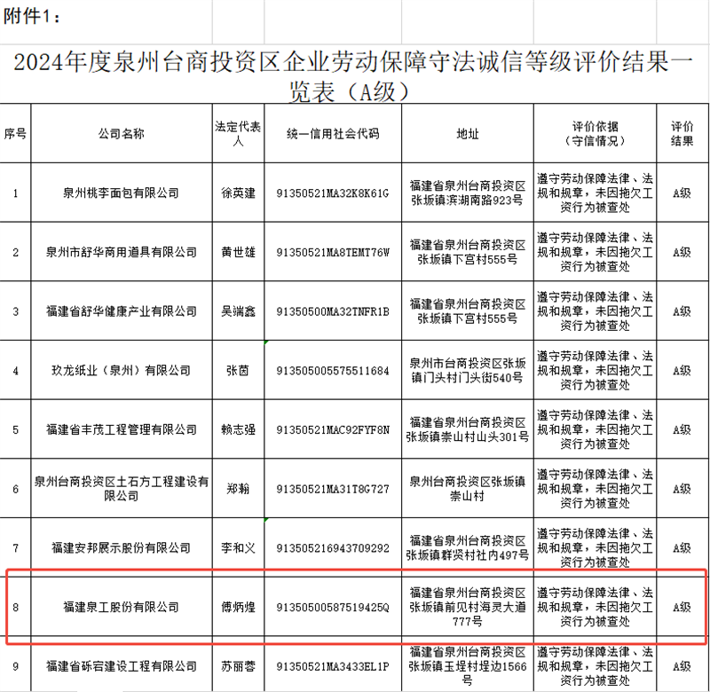 近日,根據《泉州臺商投資區(qū)管理委員會民生保障局關于開展2024年度企業(yè)勞動保障守法誠信等級評價的通知》(泉臺管民生文〔2025〕11號)文件規(guī)定,經嚴格審核,福建泉工股份有限公司(以下簡稱“泉工股份”)被評定為“2024年度企業(yè)勞動保障守法誠信等級A級企業(yè)”,成為全區(qū)25家獲此殊榮的企業(yè)之一。